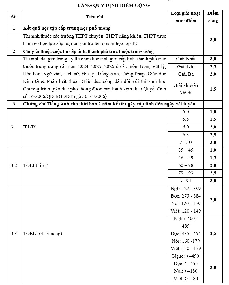 + Đối tượng 2: Thí sinh đạt giải Nhất, Nhì, Ba trong kỳ thi chọn học sinh giỏi cấp tỉnh, thành phố trực thuộc trung ương các năm 2024, 2025, 2026 ở các môn Toán, Vật lý, Hóa học, Ngữ văn, Lịch sử, Địa lý, Tiếng Anh, Tiếng Pháp, Giáo dục Kinh tế & Pháp luật (hoặc Giáo dục công dân), được cộng điểm khuyến khích trong xét tuyển.