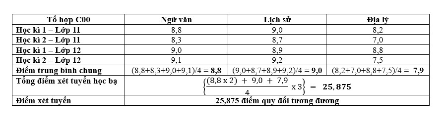 Ví dụ: Thí sinh đăng kí xét tuyển vào Ngành Luật - mã ngành 7380101 của Trường Đại học Luật, Đại học Huế theo phương thức xét tuyển học bạ, tổ hợp xét tuyển là C00: Ngữ văn, Lịch sử, Địa lí, không có điểm cộng, không thuộc đối tượng ưu tiên và có kết quả học tập như sau: