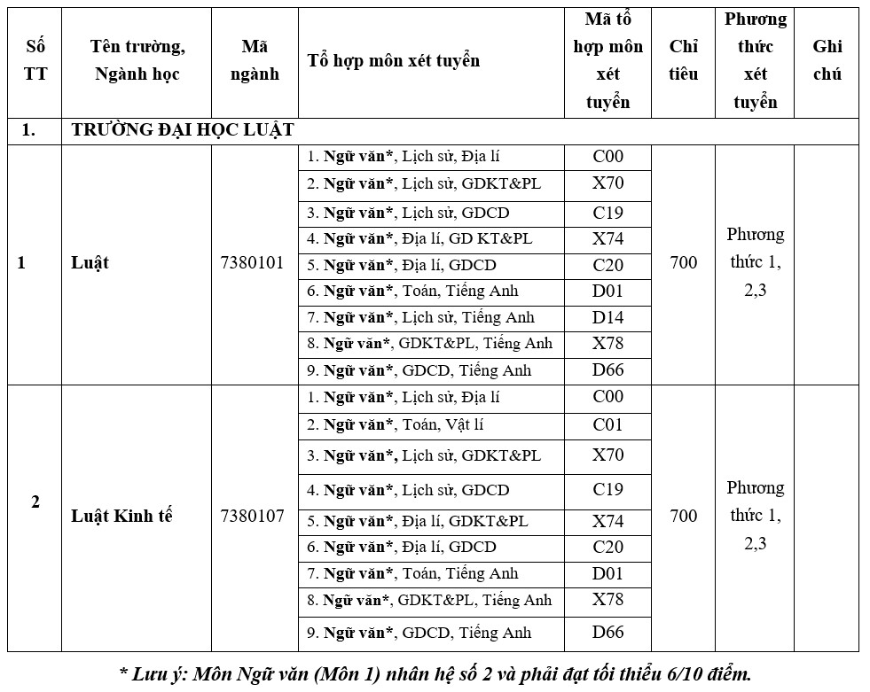 Thông tin chi tiết sẽ được quy định cụ thể tại thông báo về việc xét tuyển thẳng, ưu tiên xét tuyển của Đại học Huế và Trường Đại học Luật.